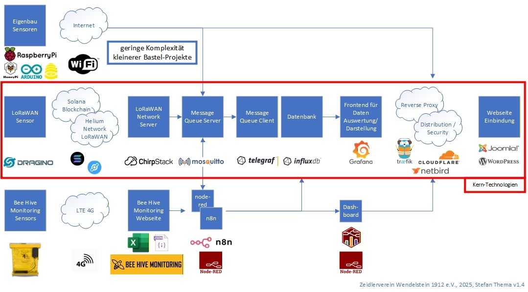 Der rot umrandete Bereich stellt hierbei die verwendete Kerntechnologie dar, welcher den Hauptteil der Datenverarbeitung tätigt. Als Funktionsprinzip erkennt man im oberen Bereich die Einbindung kleinerer Bastelprojekte unserer Vereinsmitglieder. Im unteren Bereich die Einbindung unseres digitalen Bienenvolkes.